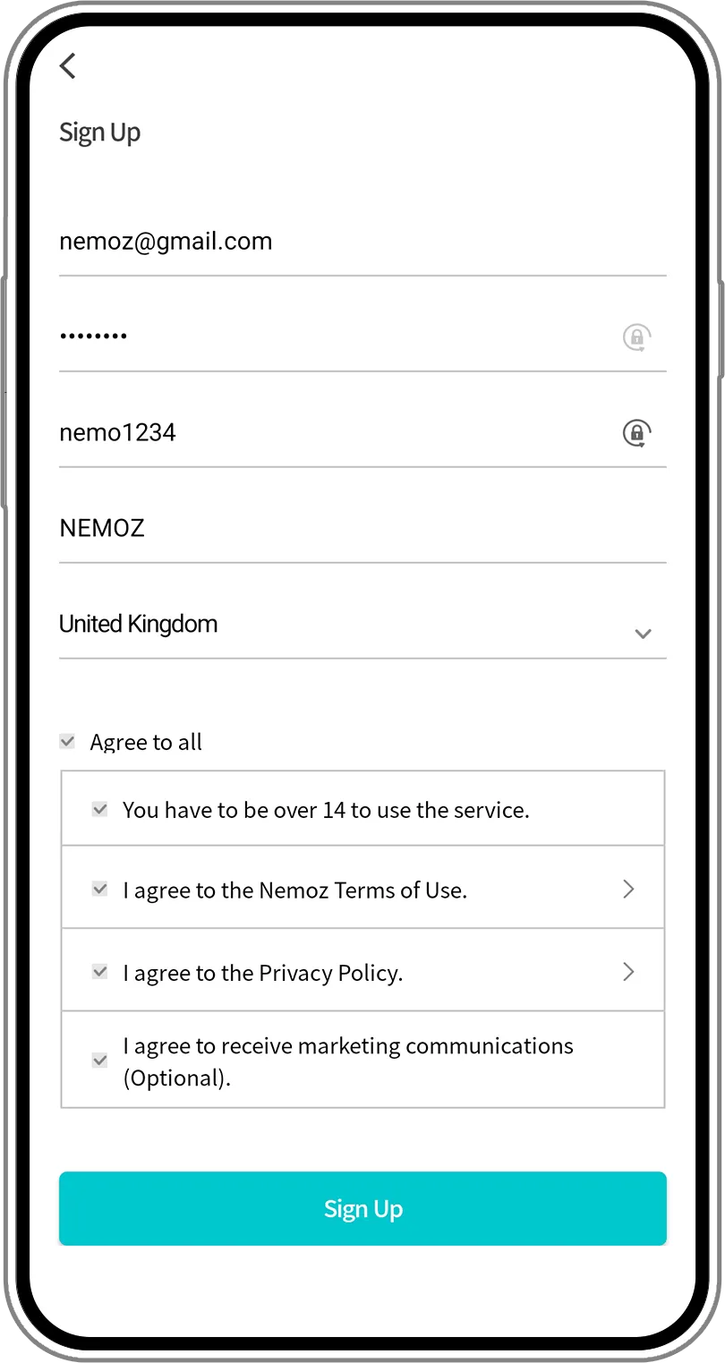 Enter all the information needed to sign up and press the 'Sign Up' button. Use an email as your ID.