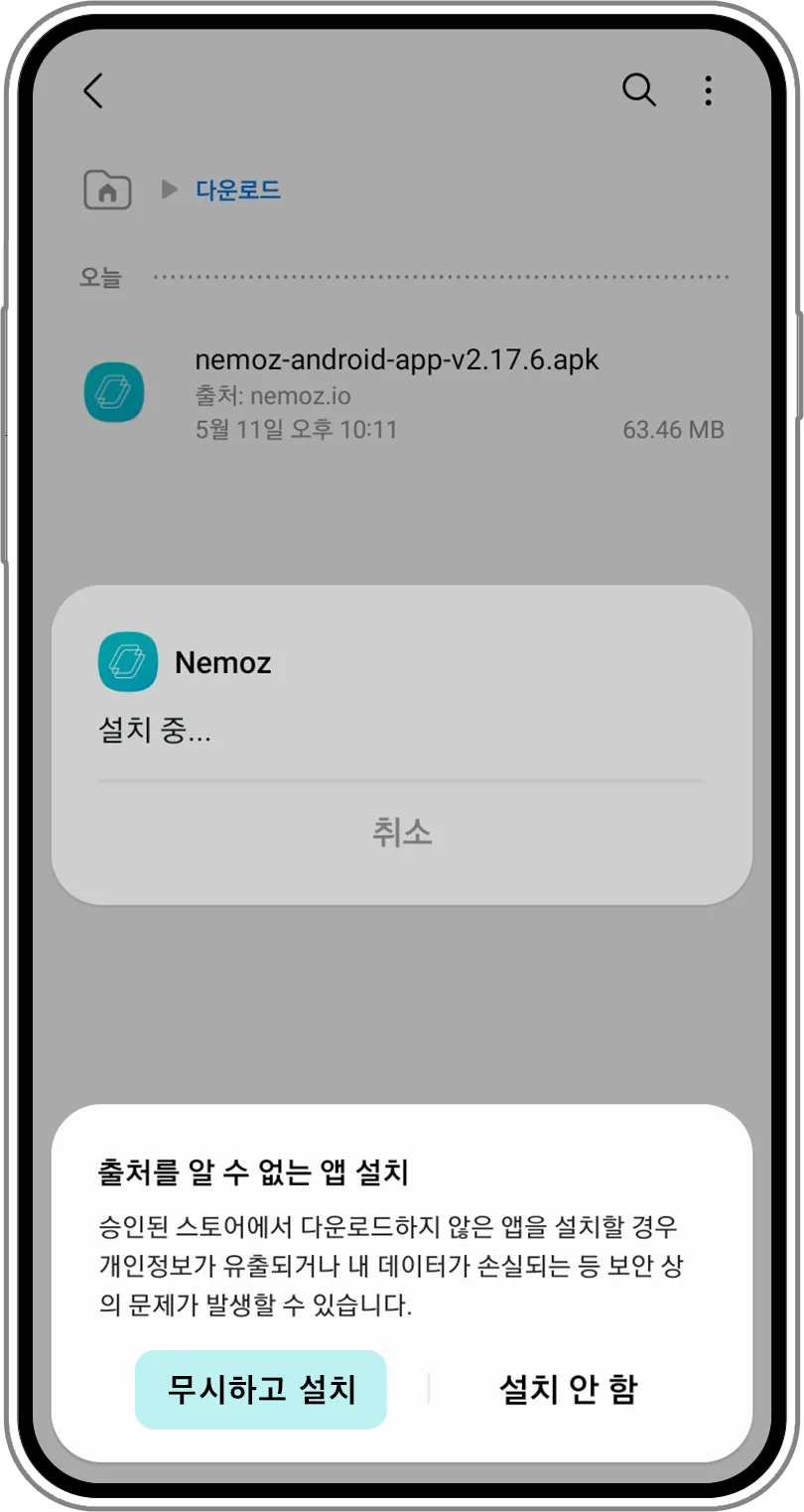 다운로드 받은 APK를 실행시켜 주세요. 내 파일 > 다운로드 폴더에서 nemoz-android-app-v2.17.6.apk 파일을 찾아서 실행시키거나, 상단 알림바에서 다운로드 받은 파일을 실행시켜 주시면 됩니다.