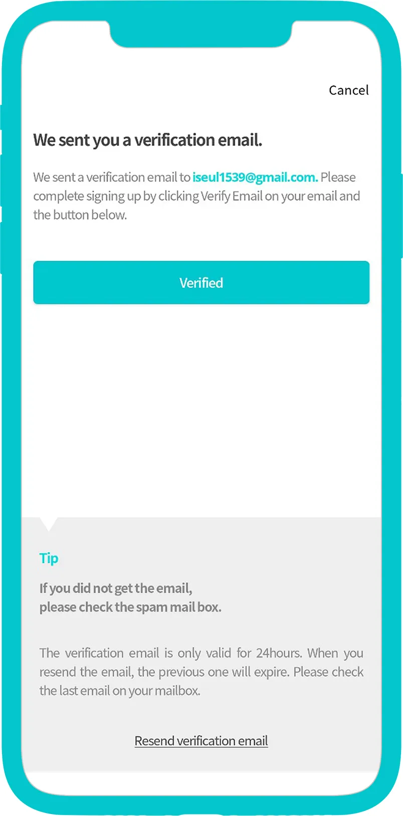 Now you got the verification email. Please press the 'Verify Email' button on your email. When you don't get the email in a minute, please check your spam mailbox.