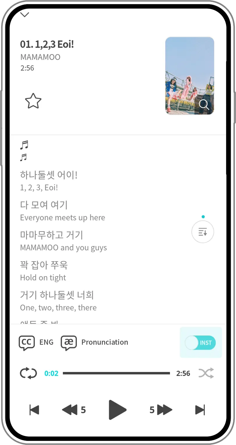 Press the AR/INST button on the right-bottom of the player to listen to music and Inst. alternatively.