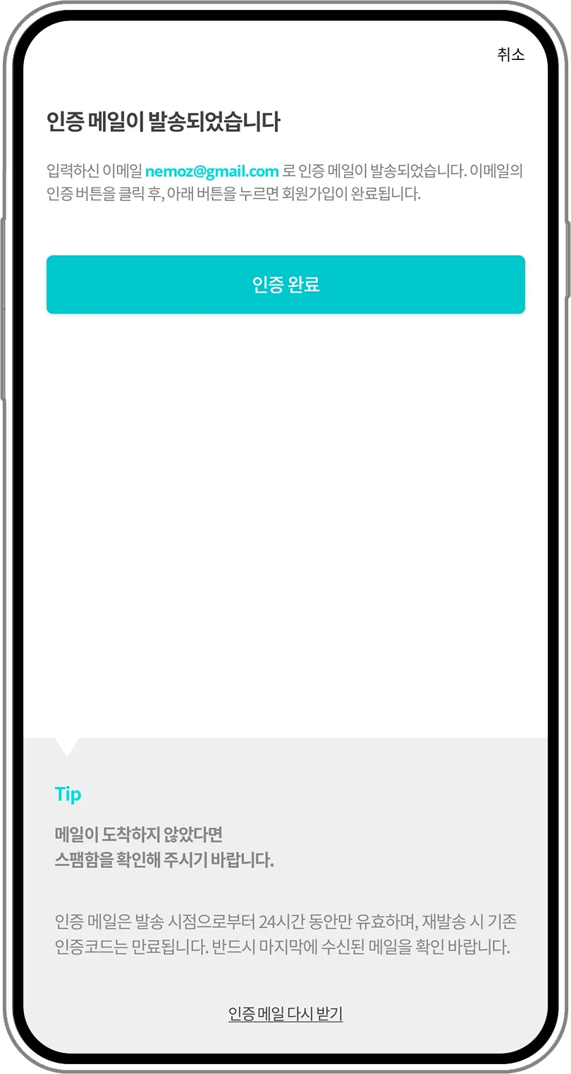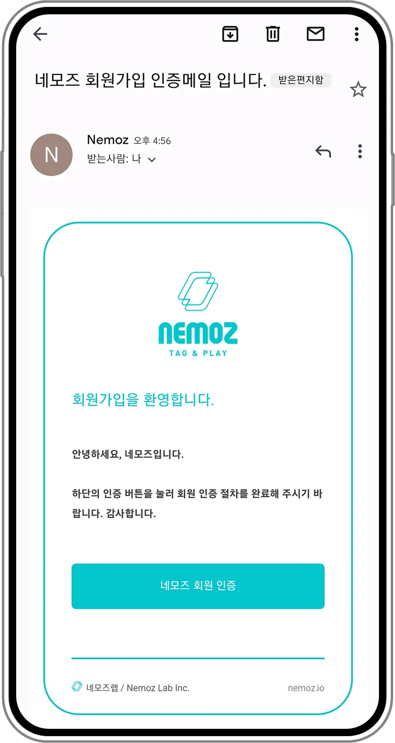 아이디에 사용한 이메일로 인증 메일이 발송됐습니다. 이메일의 ‘네모즈 회원 인증’ 버튼을 눌러주세요. 1분 이내에 인증 메일이 도착하지 않을 경우, 스팸함을 확인해주세요.