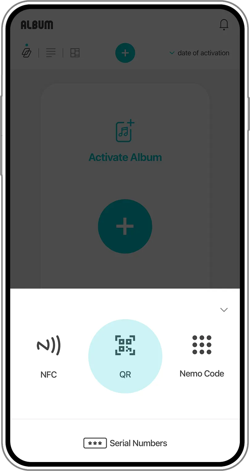 Pindai kod QR dari kartu yang termasuk dalam album dengan menekan +button di bagian atas aplikasi dan menggunakan fungsi ‘QR’