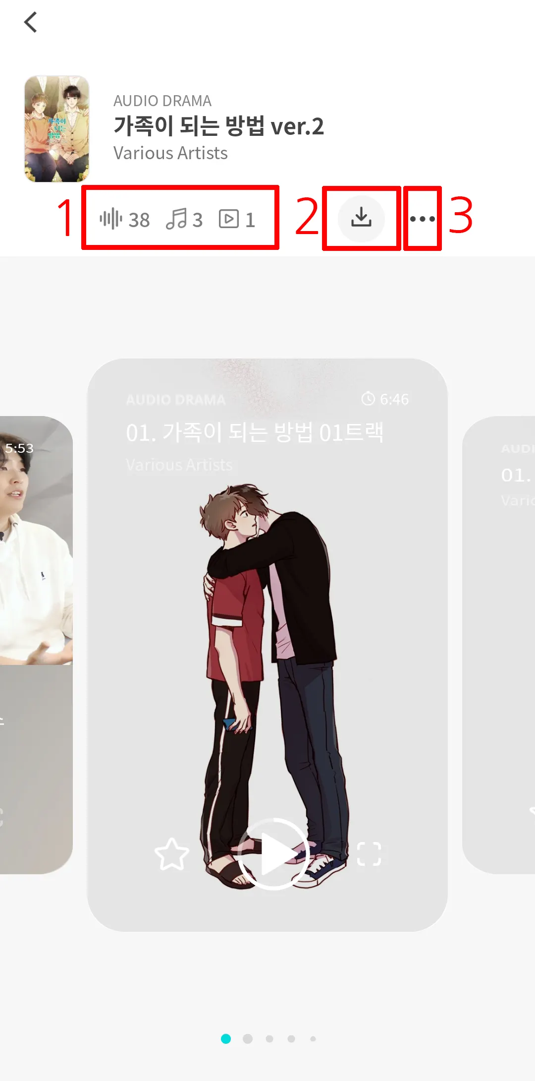 1. Informasi kartu trek untuk album. Contoh menunjukkan bahwa ada 38 track Drama Audio, 3 lagu, dan 1 video.
