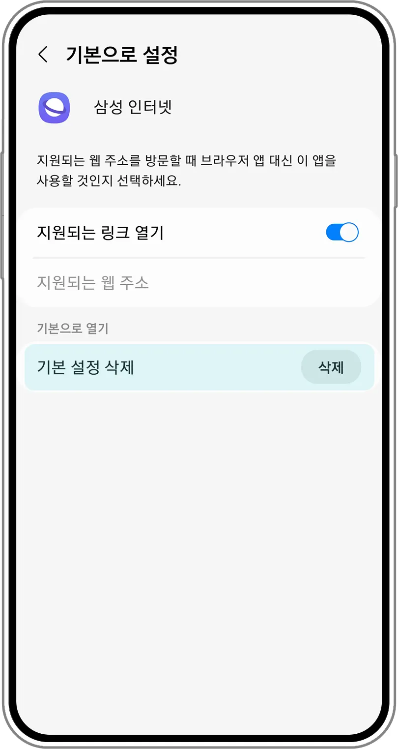 Entonces, podrás ver la lista de aplicaciones que pueden abrir enlaces. Selecciona una aplicación específica (por ejemplo, Samsung Internet) y luego pulsa el botón de eliminar configuración predeterminada.